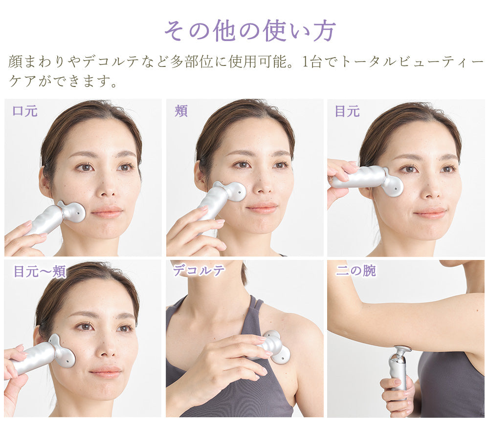 | A | 使用時間は5分以内とし、同一部位への連続使用はおやめください。使用部位を変えて連続でお使いいただくことは可能です。例)あご下5分→目元5分→口元5分 |