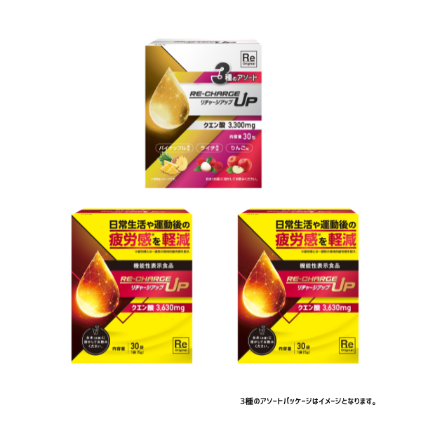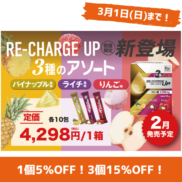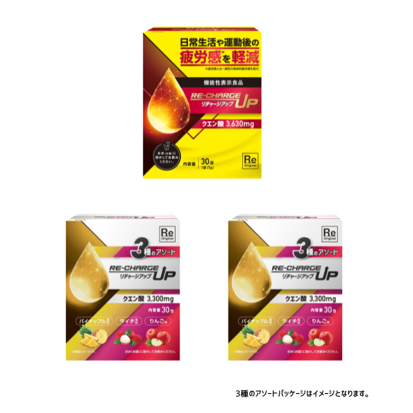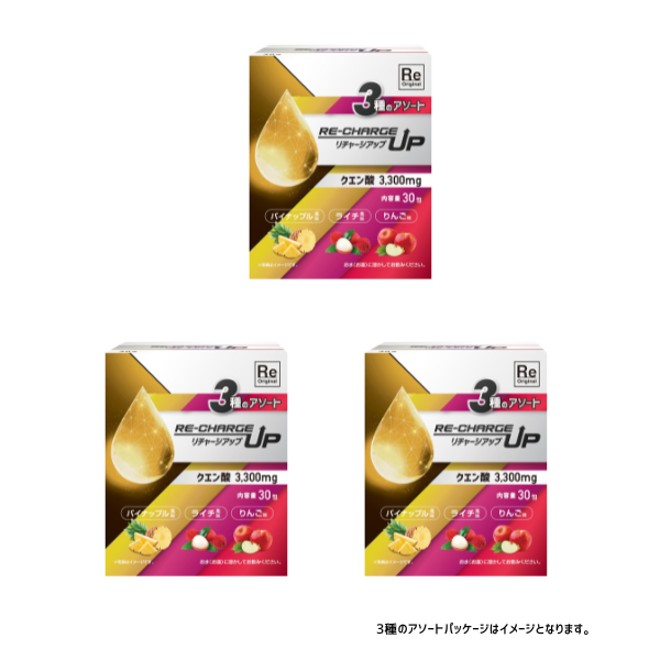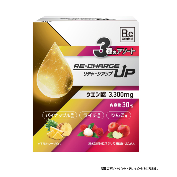 リチャージアップの人気3種(パイナップル風味、ライチ風味、りんご味)をお得に試せる数量限定アソートセットです。各10包入り!その日の気分で選べます!