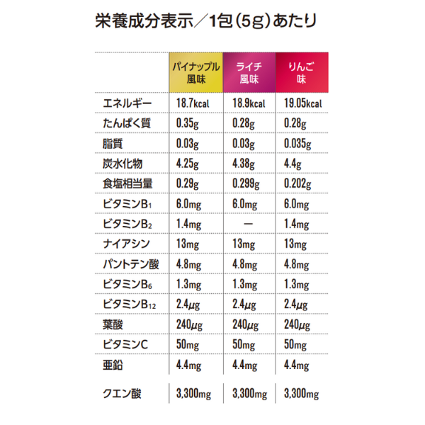 【パイナップル風味】 β-アラニン(国内製造)、亜鉛含有酵母、α-リポ酸、コエンザイムQ10、マルトデキストリン/クエ ン酸、クエン酸Na、トレハロース、甘味料(アスパルテーム・L-フェニルアラニン 化合物)、香料、微粒二酸化ケイ素、ビタミンC、ナイアシン、ビタミンB1、パント テン酸カルシウム、加工澱粉、ビタミンB2、ビタミンB6、ステアリン酸カルシウ ム、グリセリン、葉酸、ビタミンB12 【ライチ風味】 β-アラニン(国内製造)、亜 鉛含有酵母、α-リポ酸、コエンザイムQ10、マルトデキストリン/クエン酸、クエ ン酸Na、シクロデキストリン、甘味料(アスパルテーム・L-フェニルアラニン化 合物)、香料、微粒二酸化ケイ素、ビタミンC、ナイアシン、ビタミンB1、パントテ ン酸カルシウム、加工澱粉、ビタミンB6、グリセリン、葉酸、ステアリン酸カルシウム、ビタミンB12 【りんご味】 果汁パウダー(リンゴ濃縮果汁、デキストリン、砂糖)(国内製造)、β-アラニン、亜鉛含有酵母、α-リポ酸、コエンザイムQ10、マルトデキストリン/クエン酸、クエン酸Na、トレハロース、甘味料(アスパルテーム・L-フェニルアラニン化合物)、香料、微粒二酸化ケイ素、ビタミンC、ナイアシン、ビタミンB1、パントテン酸カルシウム、酸味料、加工澱粉、ビタミンB2、ビタミンB6、ステアリン酸カルシウム、グリセリン、葉酸、ビタミンB12、(一部にりんごを含む) |
